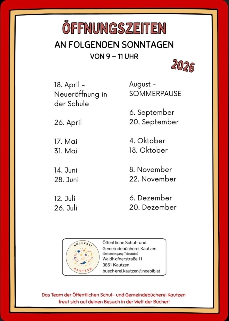 Die schulischen Entlehnungen bleiben so wie bisher in den großen Pausen. Zusätzlich haben ab jetzt alle Bürgerinnen und Bürger an folgenden Sonntagen jeweils zwischen 09:00 und 11:00 die Möglichkeit zum Ausborgen von Lesematerial oder einfach nur zum Schmökern: